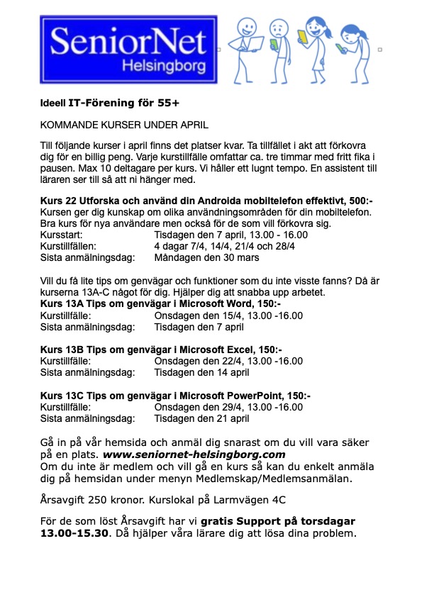 Torsdag den 23 april 2026 kl.13:00 – 15:30 medverkar Carin Olofsson från Kursgruppen på IT-support och kommer att svara på frågor om Windows. Välkomna, IT-support SeniorNet
